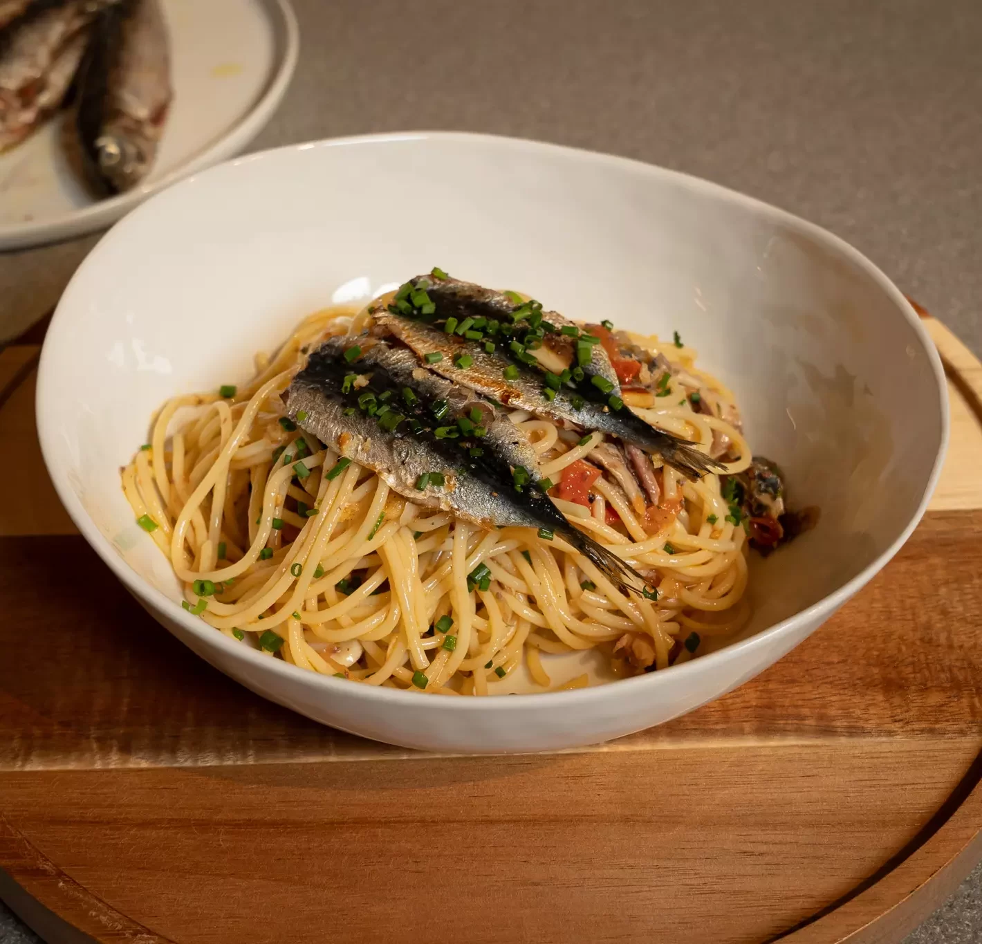 9. Sirve la pasta y sobre esta el panko, los piñones, las sardinas tostadas y el perejil.